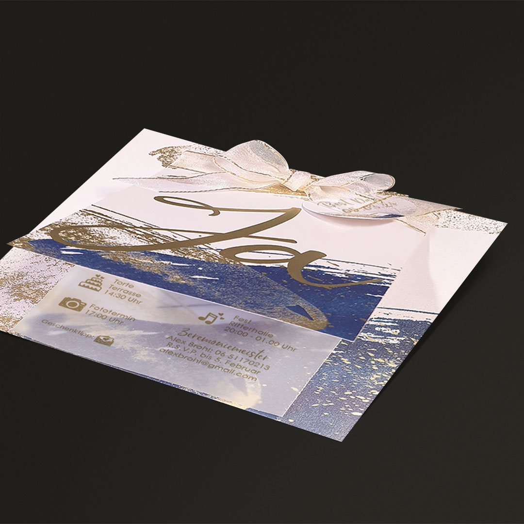 Moderne Hochzeitseinladungen im Aquarell-Style mit Transparentpapier und Schleifenbindung