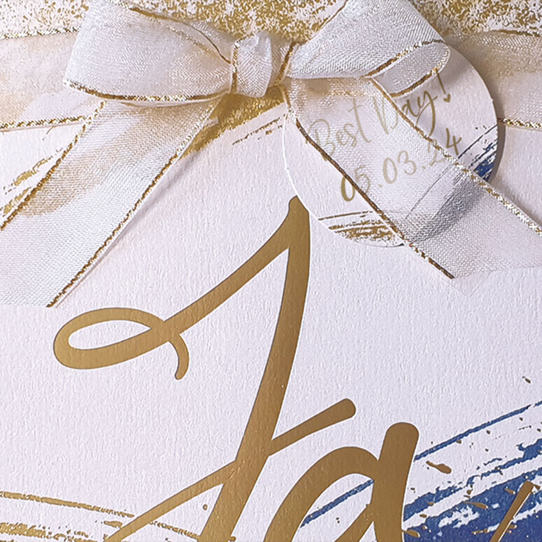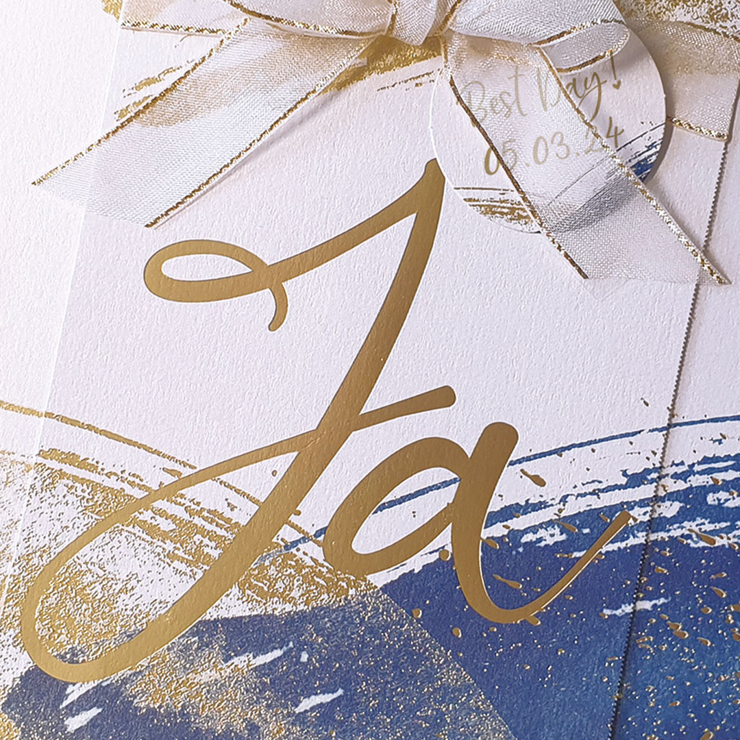 Die goldenen Elemente auf der Karte sind in matt glänzendem Foliendruck aufgebracht und sorgen für eine dezente, edle Optik. Die Karten lassen sich fächerartig öffnen, was ein außergewöhnliches und zugleich praktisches Format für Ihre Hochzeitseinladungen bietet.