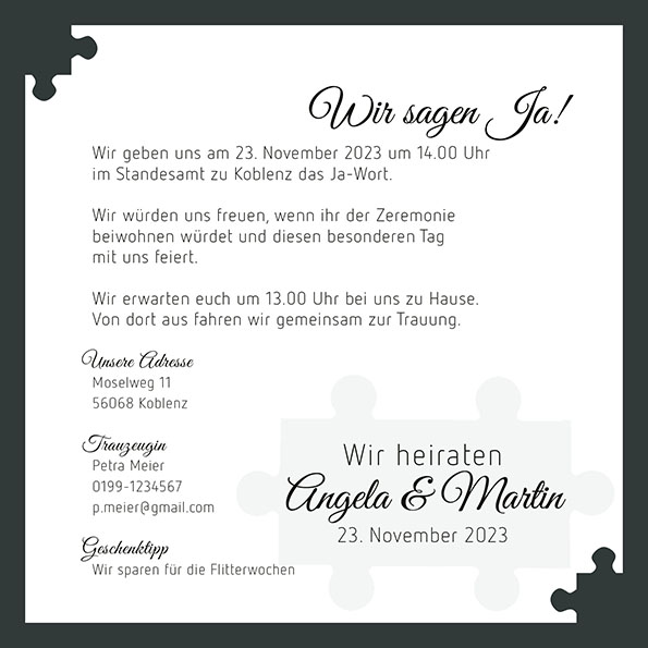 ACHTUNG: Das hellgraue Puzzle-Teil in der Abbildung unten symbolisiert die Stanzung in der Karte. Dieser Bereich ist bei geschlossener Einladung auf der Aussenseite sichtbar. Der graue Ton dient nur der Veranschaulichung und wird nicht mitgedruckt.