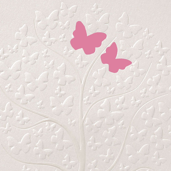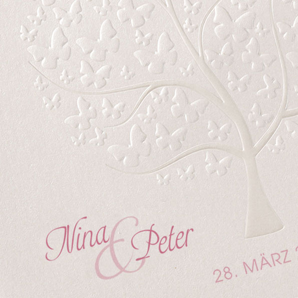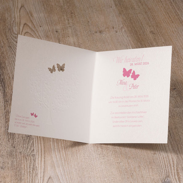 Diese traumhaft romantischen Hochzeitseinladungen verzaubern mit einem kunstvoll geprägten Baum aus Schmetterlingen als Highlight. Zwei formgestanzte Schmetterlinge auf der Vorderseite geben den Blick auf das Innere der Karte frei, wo farbige Schmetterlinge für einen zusätzlichen Akzent sorgen.