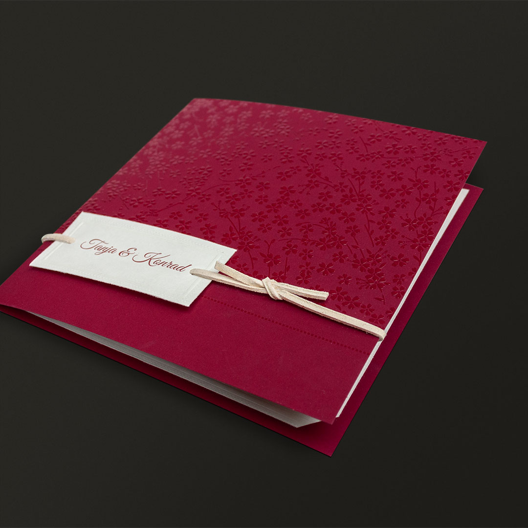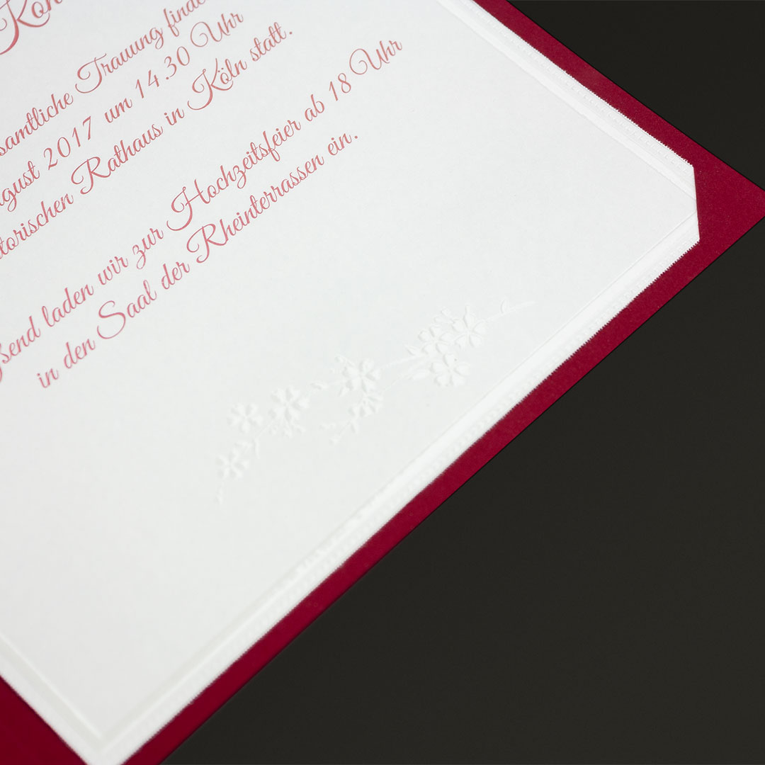 Ihr möchtet Eure Gäste mit stilvollen und besonderen Hochzeitseinladungen begeistern? Diese wunderschön gearbeiteten, roten Einladungskarten überzeugen mit geprägten Blumenmustern, die durch ihren sanften Glanz einen reizvollen Kontrast zum matten Kartonmaterial bilden.