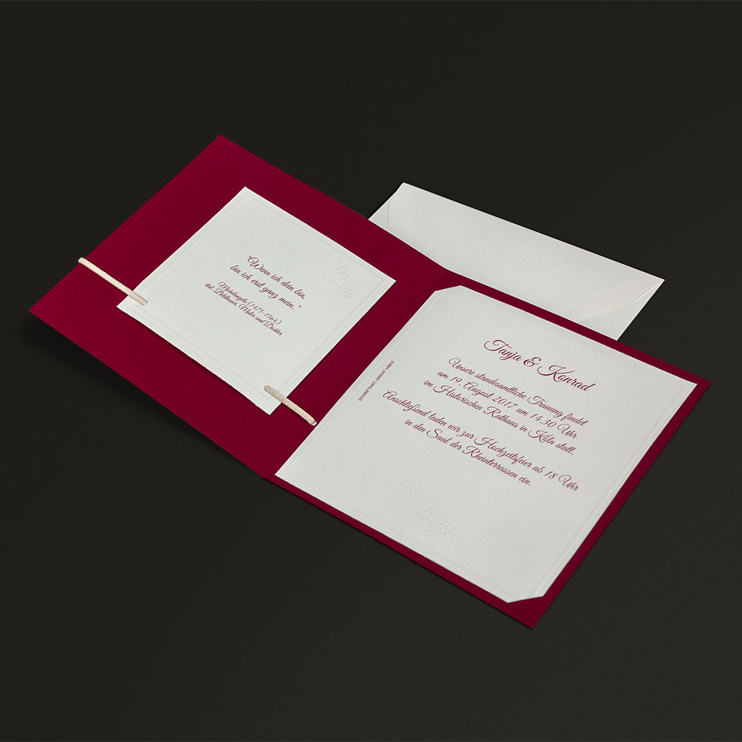 Ein kleines Highlight: Eine lederartige Kordel, an die auf der Außenseite ein Anhänger und auf der Innenseite ein Zusatzkärtchen geknüpft werden können – ideal für zusätzliche Informationen. Die Einladungstexte werden auf einen quadratischen Texteinleger gedruckt.