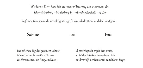 Die Texte werden von unseren Profis passend zur Karte in Form gebracht. In Kürze erhaltet Ihr noch vor Druckbeginn per E-Mail eine PDF-Datei zur Ansicht. Hier ist die Karte zu sehen, wie sie bedruckt aussehen wird. Natürlich könnt Ihr dann an Euren Texten noch Änderungen vornehmen lassen – ohne Aufpreis.