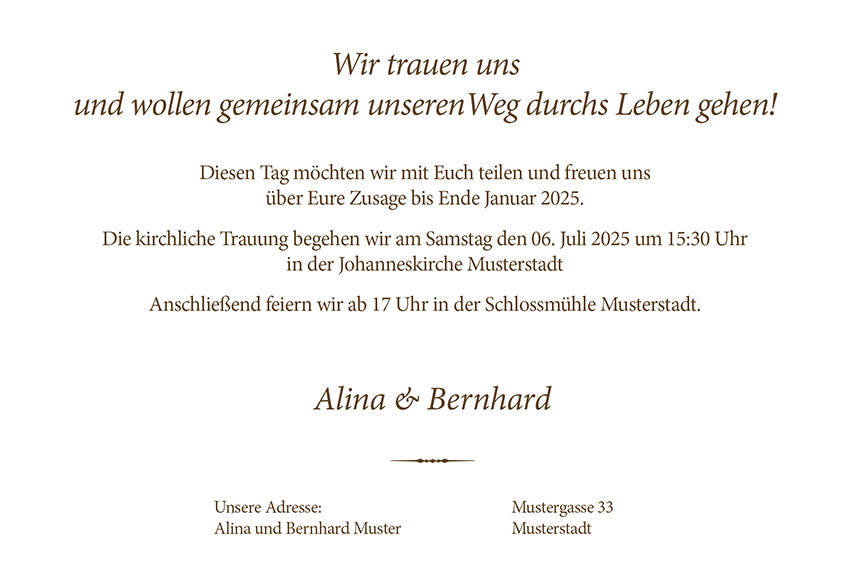 Übrigens: Die Abbildungen unten dienen als Ansicht oder Inspiration für Euch. Wir werden Eure persönlichen Texte in diesem Style gestalten. Es sei denn, Ihr äußert andere Wünsche.
