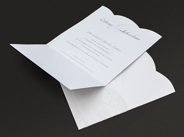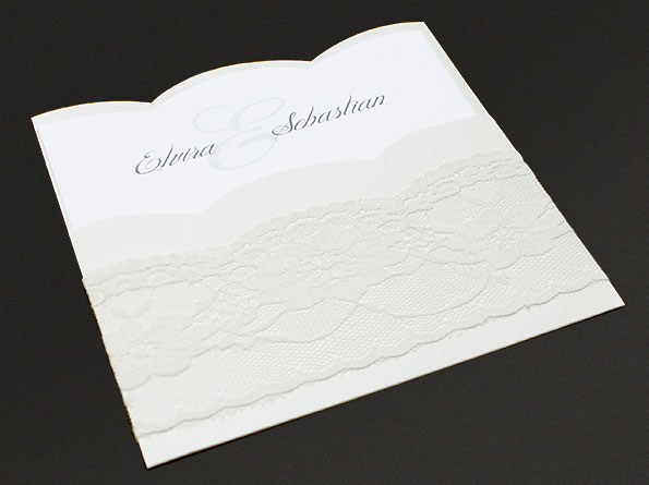 Weiße Hochzeitseinladungen mit Spitze und welliger Formstanzung