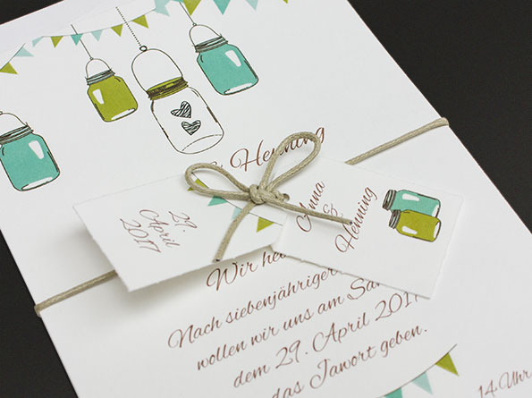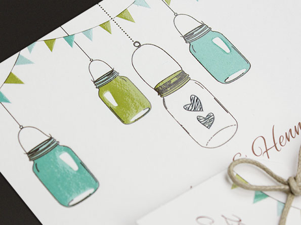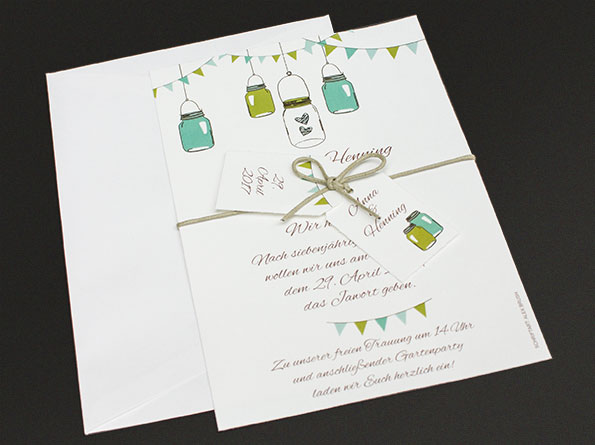 Diese einzigartigen Einladungskarten zur Gartenhochzeit überzeugen mit ihrem besonderen Format und sommerlichem Design. Emailleartig glänzende mintgrüne Windlichter und Wimpel verleihen den Karten eine leichte, fröhliche Gartenatmosphäre.
