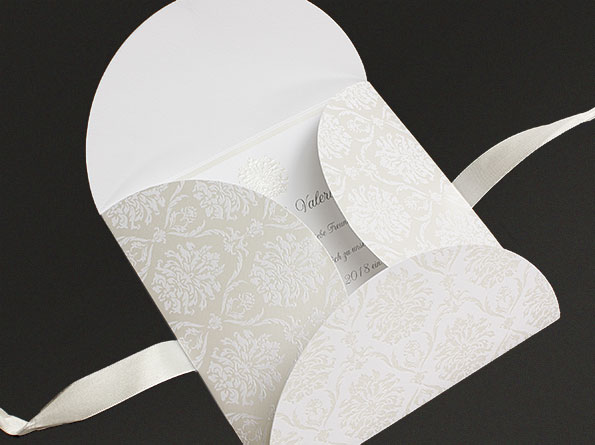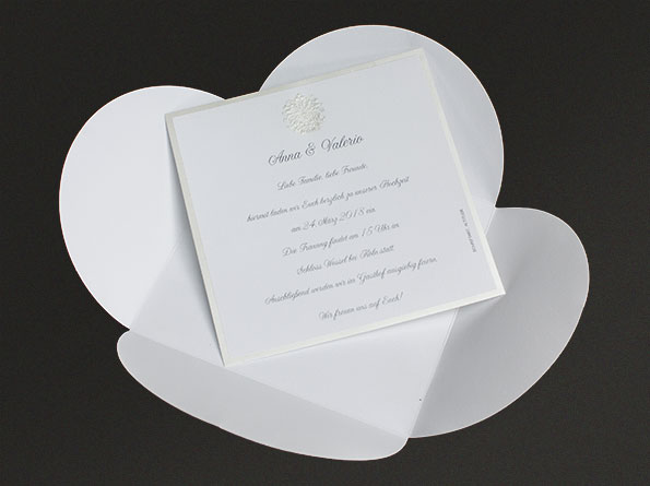 Im Inneren befindet sich ein hochwertiger Einleger, auf den Eure Einladungstexte gedruckt werden. Auch dieser ist mit einer dezenten Prägung versehen und verleiht der Karte eine besondere Wertigkeit. Eine elegante, weiße Schleife rundet das romantische Design ab.