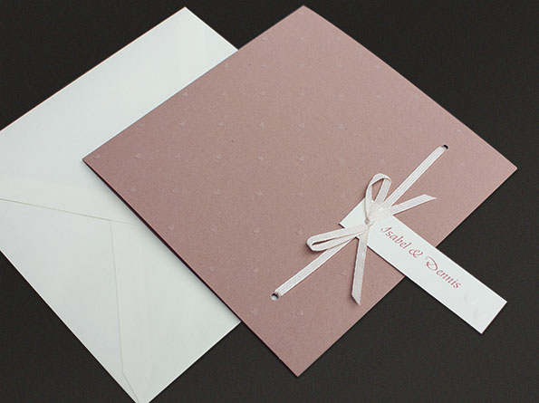 Einladungskarten zur Hochzeit, Vintage-Style, gefertigt aus einem leicht ins Violette spielenden Kraftkarton. Geprägte kleine Herzen, mit einer Schleife anzuknüpfter Anhänger. Die Texte drucken wir auf einen Einleger, der in die Karten eingesteckt wird.