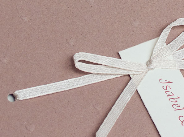 Einladungskarten, vintage aus braunem Kraftarton mit angeknüpftem, weißen Schleifchen.