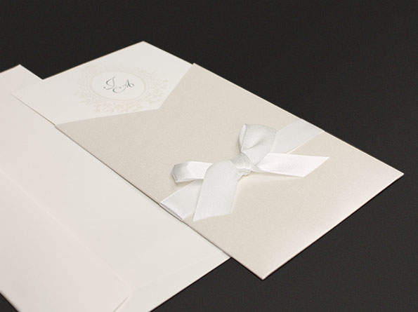 Hochzeitseinladungen, cremefarben mit weißer Schleife.