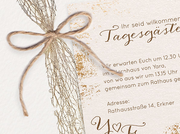 Ihr plant eine stilvolle BoHo-Hochzeit und möchtet Eure Gäste mit exklusiven Einladungskarten beeindrucken? Diese luxuriösen Karten sind genau das Richtige! Ein goldenes Spitzenband, zusammengebunden mit einer stabilen Kordel, bildet das Highlight dieser außergewöhnlichen Hochzeitseinladungen.