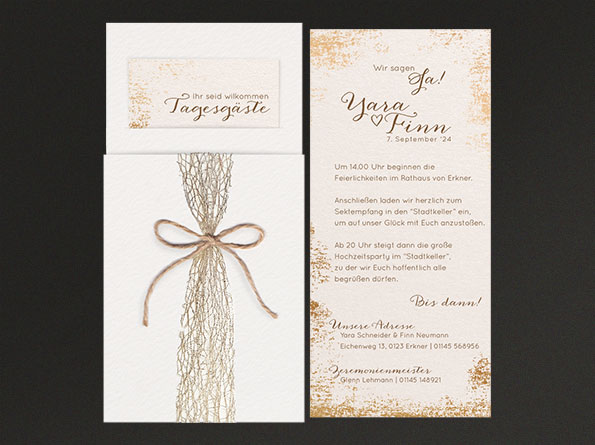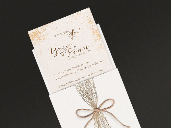 Die Hülle aus hochwertigem Aquarellkarton strahlt natürliche Eleganz aus, während die Einleger und Zusatzkärtchen aus perlmuttartig schillerndem Karton gefertigt sind. Für einen glamourösen Akzent sorgen die Veredelungen mit goldenem Foliendruck, die Euren Einladungstexten einen edlen Glanz verleihen.