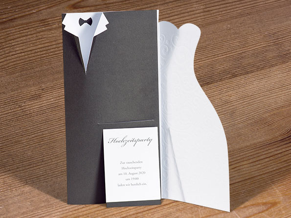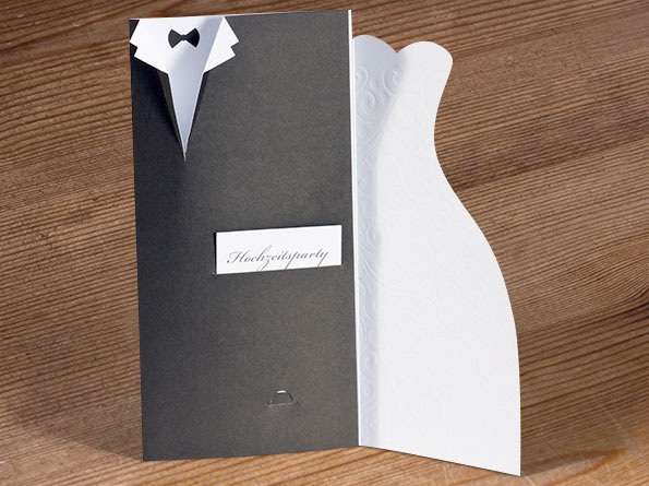 Hochzeitseinladungen in Form von Brautkleid und Hochzeitsanzug