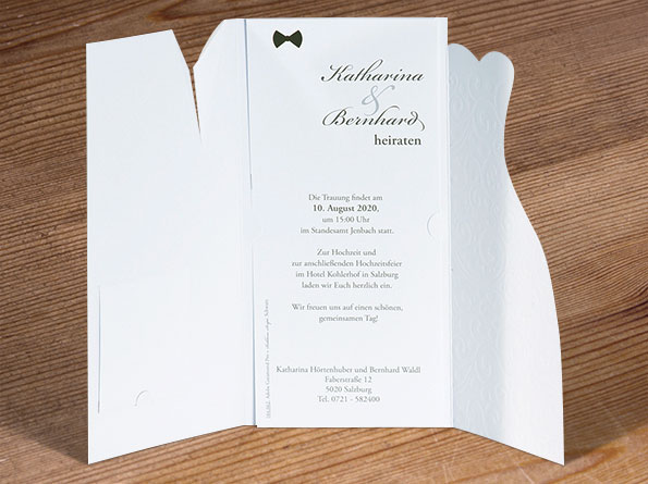 Besonders hervorzuheben sind die hochwertigen Formstanzungen und Prägungen, die diesen Karten einen edlen und außergewöhnlichen Charakter verleihen. Ein praktisches Extra ist das Kärtchen, das in die Brusttasche des Hochzeitsanzugs gesteckt wird – ideal, um zusätzliche Informationen wie Uhrzeiten, Wegbeschreibungen oder Hinweise zum Dresscode unterzubringen.