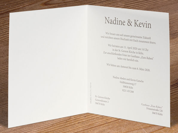 Die Texte werden direkt auf die Hochzeitskarten gedruckt, sodass die Karten sofort einsatzbereit sind. Dies sorgt für ein sauberes, professionelles Ergebnis und eine einfache Handhabung ohne zusätzlichen Aufwand.