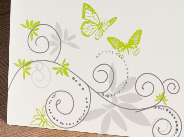 Diese grünen Hochzeitseinladungen sind mit zarten Schmetterlingen und eleganten Blumenranken verziert. Silberne Glanzakzente in Form aufgedruckter Perlen verleihen den Karten ein edles, festliches Erscheinungsbild.