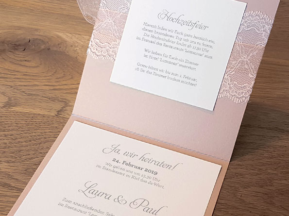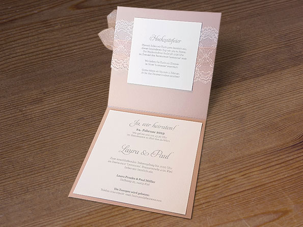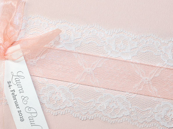 Mit dieser stilvollen Einladung steht Euer Fest ganz im Zeichen der Romantik. Rosa schillernder Karton umhüllt mit feiner Spitze und Organzabändchen.
