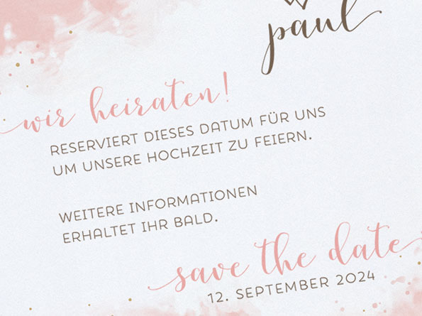 … ziert diese rosa gehaltenen Hochzeitseinladungen. Schillernder Karton und goldener Foliendruck kommen bei der Fertigung dieser Hochzeits-Serie zur Verwendung. Zusammen mit der Hochzeits-Papeterie aus dem Set wird Euer schönster Tag perfekt werden!
