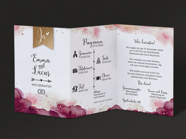 Ihr möchtet Eure Hochzeit mit originellen und eleganten Einladungskarten ankündigen? Diese lila Aquarell-Einladungskarten sind die perfekte Wahl! Gefertigt aus schillerndem Karton und mit einem innovativen, zweimal gefalzten Design, sorgen sie für einen besonderen Hingucker.