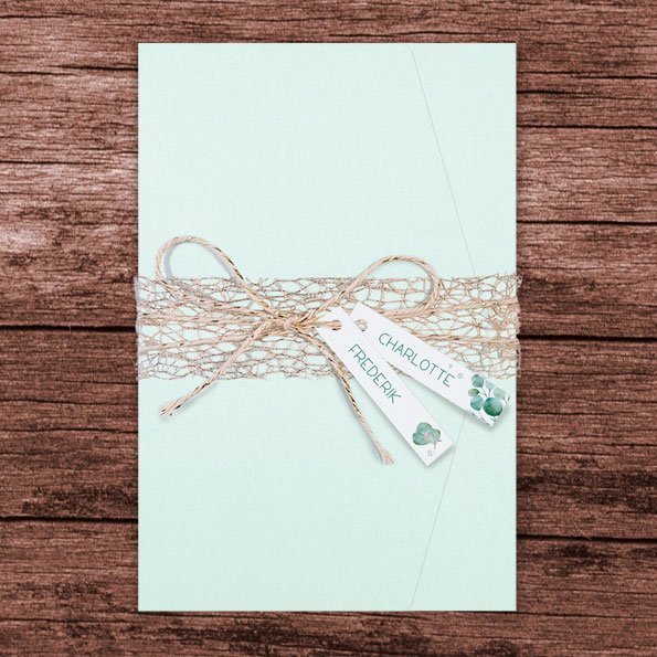 Mintgrüne Hochzeitseinladung mit Spitzenband.