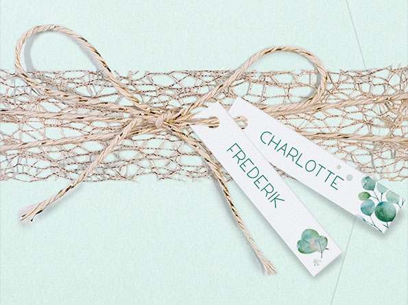An die Kordel können kleine Anhänger mit den Namen des Hochzeits-Paares angeknüpft werden. Hiervon stehen drei verschiedene Versionen zur Auswahl. Gefertigt sind die Einladungskarten zur Hochzeit aus mint-grünem, schillernden Karton. Diese als Mappe hochwertig gestaltete Hochzeits-Papeterie enthält innen einen großen Texteinleger, sowie zwei kleine Zusatzkärtchen, welche mit Textinformationen für die Hochzeitsgäste, wie Geschenkwünschen, etc. bedruckt werden können. Die Einleger bestehen ebenfalls aus schillerndem, jedoch weißen Material.