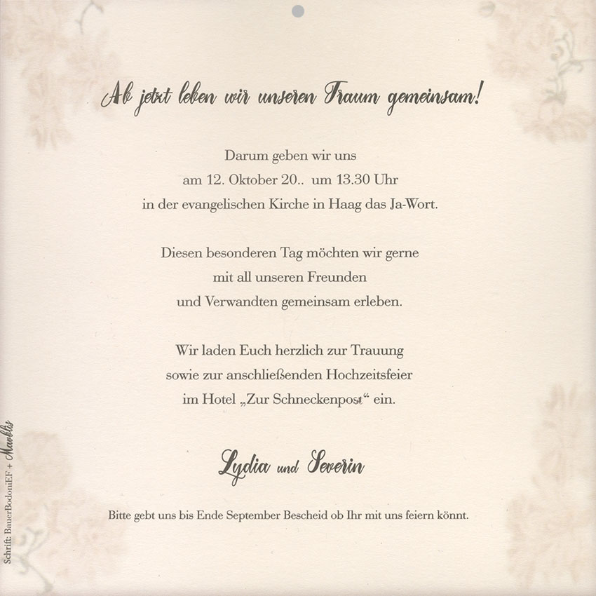 Cremefarbener, bedruckter Texteinleger der Hochzeitseinladungen.