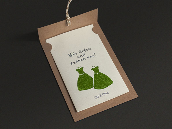 Da wir die Karten dieser Serie individuell für Euch fertigen, können gerne auch andere oder Eure eigenen Motive an Stelle der hier dargestellten beiden Brautkleider verwendet werden. Auch verschiedene Farben sind möglich. Fragt uns einfach: